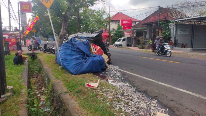 JEMBRANA, MediaBaliNews – Sebuah mobil pikap Grand Max bermuatan ikan mengalami pecah ban hingga terguling di Jalan Nasional Denpasar-Gilimanuk, tepatnya di KM 89-90 Desa Mendoyo Dangin Tukad, Kecamatan Mendoyo, Kamis (8/6). Akibatnya muatan puluhan ikan-ikan tersebut berserakan di tepi jalan.