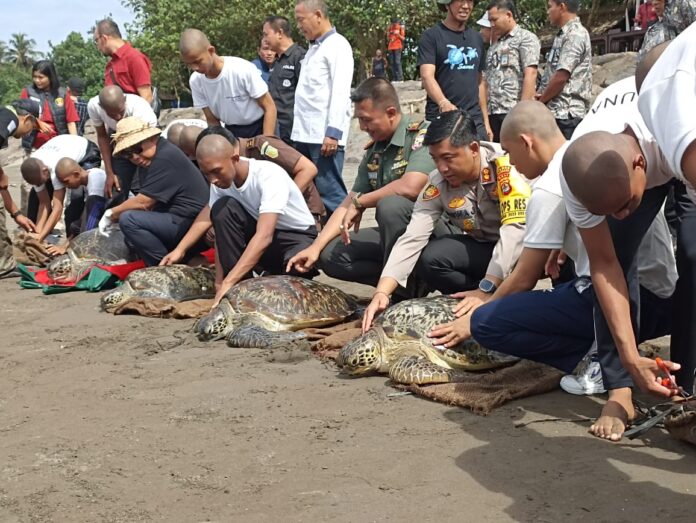 JEMBRANA, MediaBaliNews – Belasan penyu hijau yang hendak diselundupkan oleh seorang pria bernama Roslan Bai Dawi (29) asal Kelurahan Gilimanuk kini di lepasliarkan di pantai Prancak, Desa Prancak, Kecamatan Jembrana, Selasa (21/11).