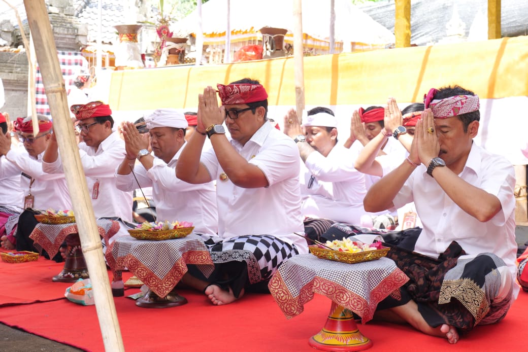 TABANAN, MediaBaliNews – Wujud pelaksanaan visi dalam bidang pelestarian adat, agama, seni dan budaya di Kabupaten Tabanan, Bupati Tabanan, I Komang Gede Sanjaya senantiasa hadir dan berikan dukungannya dalam berbagai kegiatan upacara yadnya di masyarakat. Pada Minggu, (1/9), Sanjaya hadiri Uleman Ngupasaksi Karya Ngenteg Linggih di Pura Dalem, Catus Pata, lan Prajapati Desa Adat Gelunggang, Desa Mundeh Kangin, Kecamatan Selemadeg Barat, Tabanan.