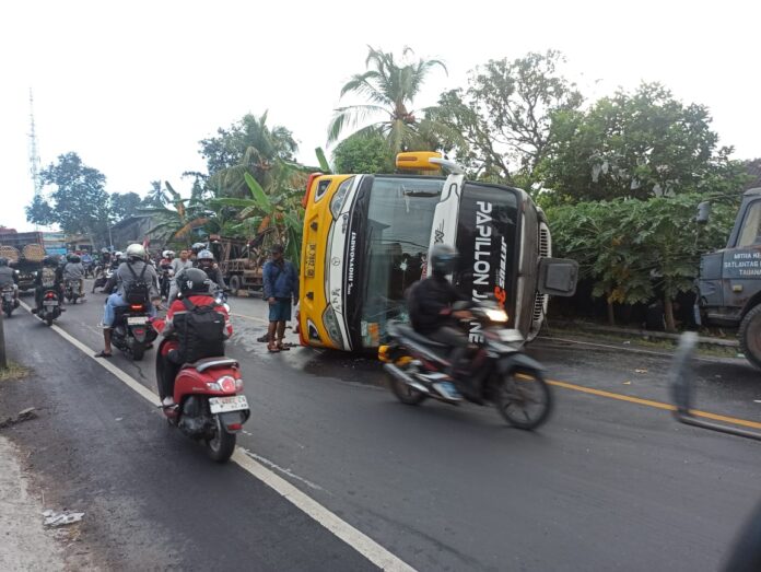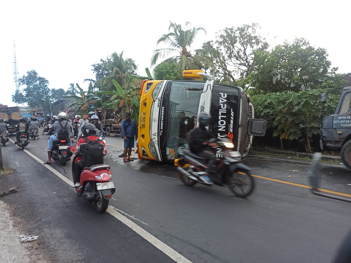 Bus Sarwonadi dengan nomor polisi DK 7882 GB terguling dan menyebabkan beberapa penumpang dan kru bus mengalami luka ringan.