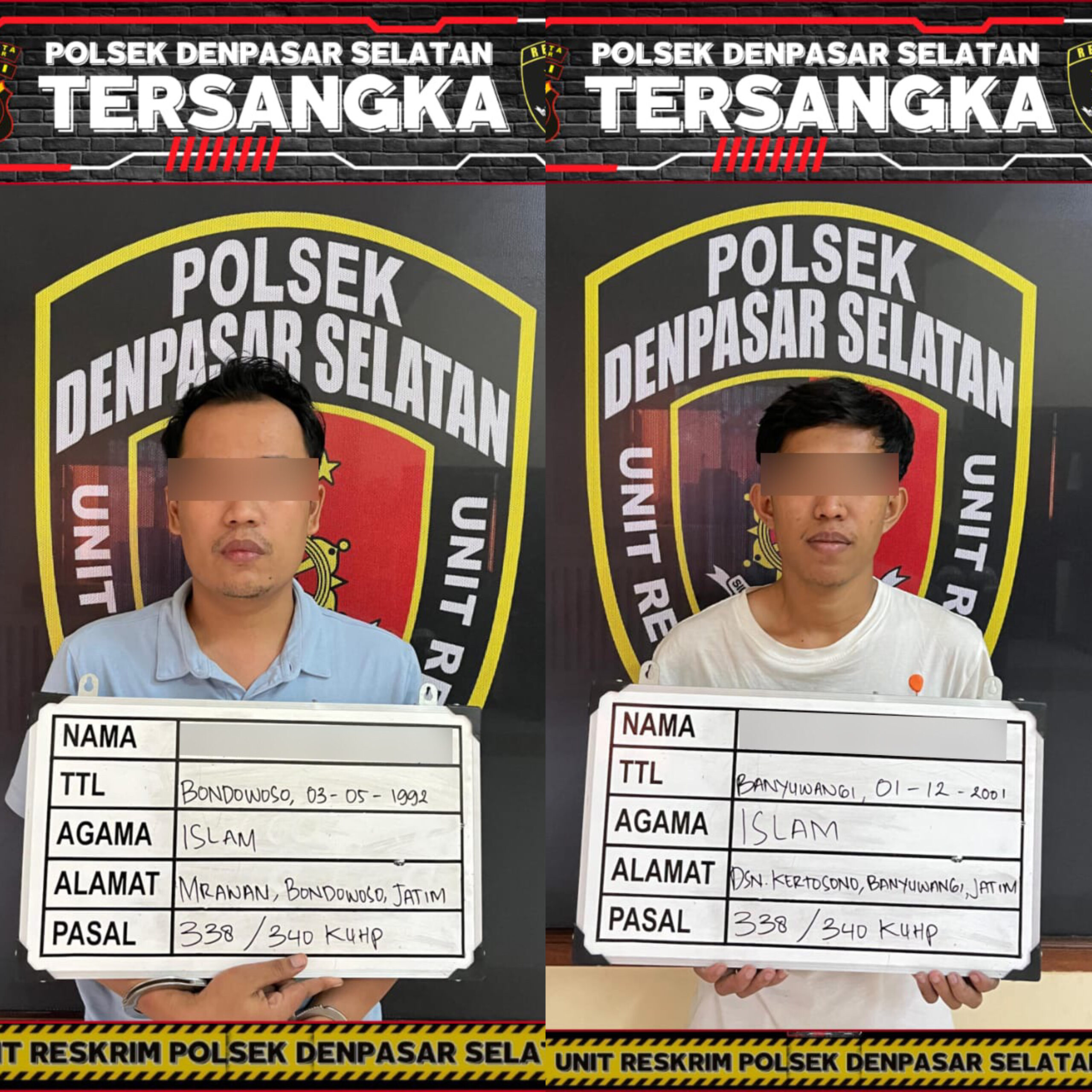 Kepala Seksi Humas Polresta Denpasar, Ajun Komisaris Polisi (AKP) I Ketut Sukadi, Selasa (28/5/2024), menjelaskan, kedua pelaku masing-masing berinisial MBW (33) dan DAR (23). Mereka ditangkap tanpa perlawanan setelah identitas dan lokasi persembunyiannya diketahui aparat gabungan dari Ditreskrimum Polda Bali, Unit Jatanras Polresta Denpasar, serta Unit Reskrim Polsek Denpasar Selatan.