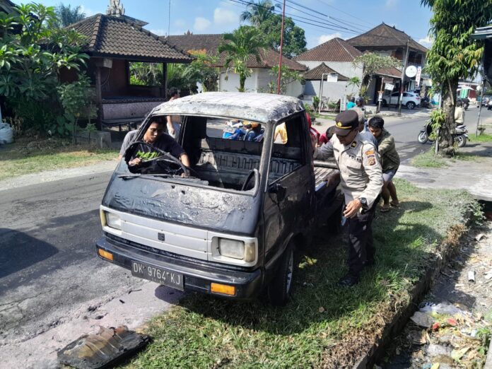 Ketika menoleh ke sumber ledakan, saksi melihat mobil Carry pikap hitam DK 9764 KJ yang dikendarai oleh I Ketut Ardana (21) sudah terbakar di depan warung milik Ni Wayan Suratni (56).