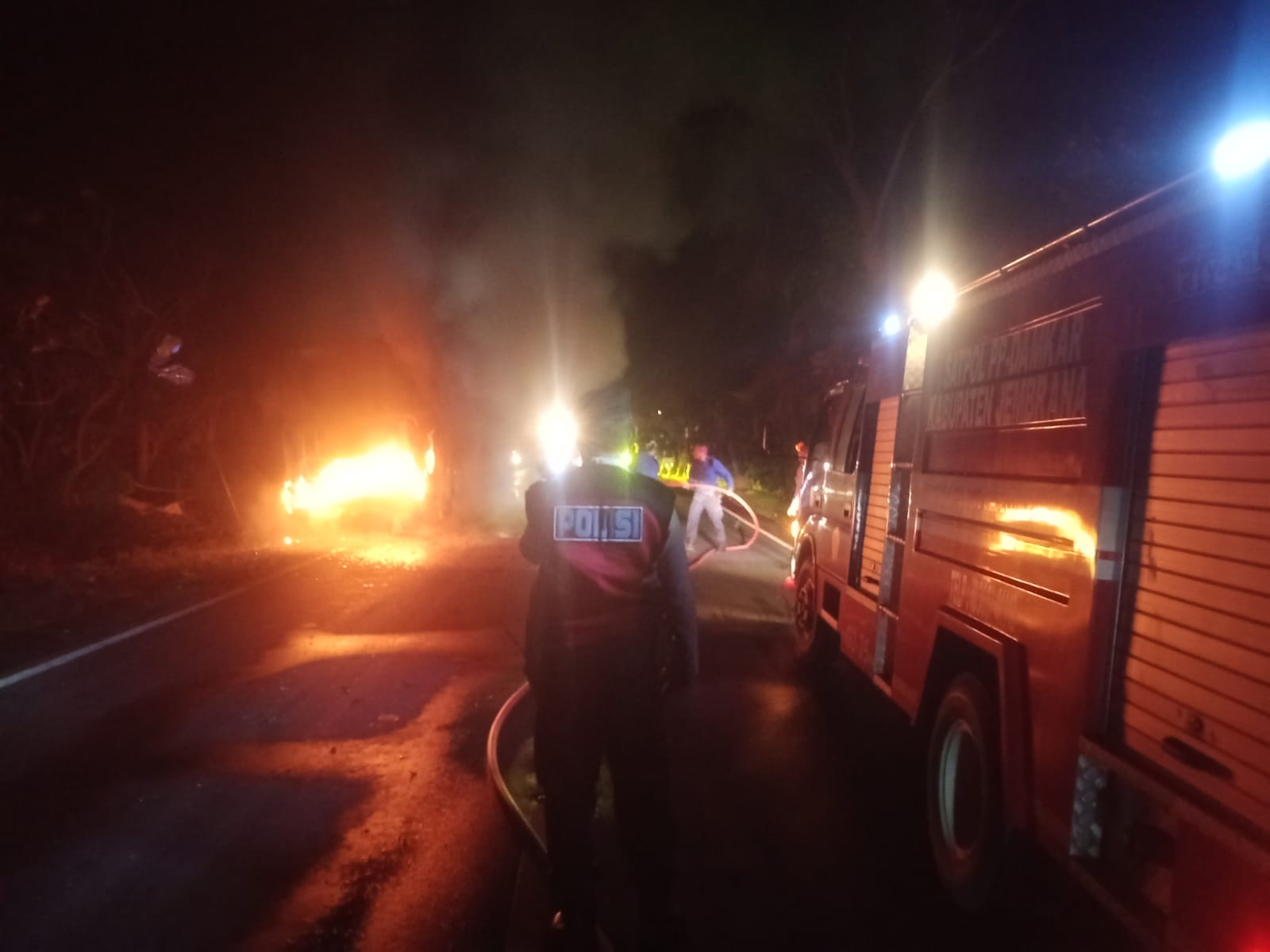 Selang beberapa menit, petuga Damkar Jembrana akhirnya tiba dilokasi dan langsung melakukan pemadaman terhadap kendaraan Bus yang terbakar.