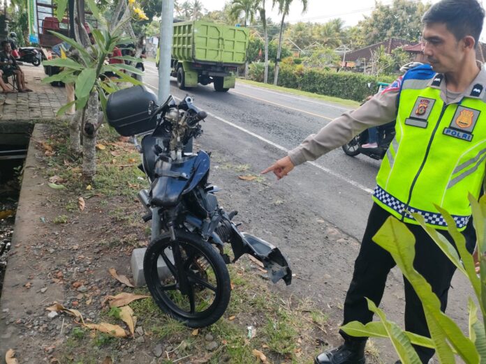 JEMBRANA, MediaBaliNews – Disenggol kendaraan lain, pengendara sepeda motor oleng hingga hantam mobil dari lawan arah di Jalan Raya Jurusan Denpasar-Gilimanuk KM 78-79, Banjar Pasar, Desa Yehembang, Kecamatan Mendoyo, Kabupaten Jembrana, Senin (6/5).