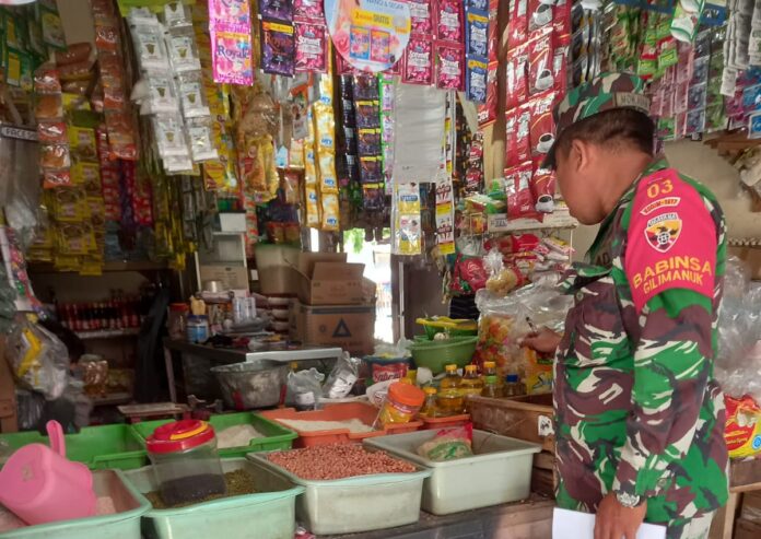 JEMBRANA, MediaBaliNews – Dalam mendukung program ketahanan pangan nasional, personil Babinsa Koramil 1617-03/Melaya, Kodim 1617/Jembrana, Serda Mohammad Adam lakukan pengecekan harga bahan pokok di Pasar Umum Gilimanuk, Kecamatan melaya Kabupaten Jembrana, Kamis (29/2).