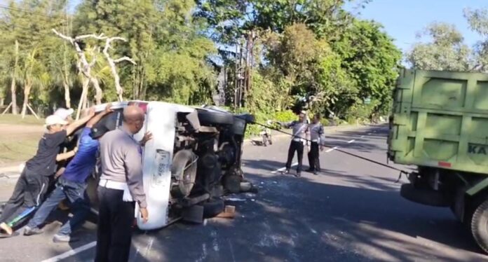 Menurut informasi, kecelakaan tunggal yang dialami kendaraan travel Mits L300 ST Wagon nopol M 1658 AY tersebut terjadi sekitar pukul 08.30 Wita pagi tadi.
