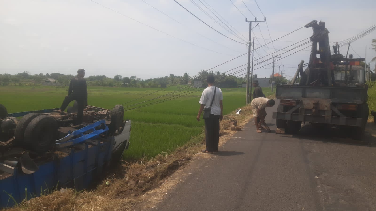 TABANAN, MediaBaliNews – Sebuah truk bermuatan pasir terguling ke sawah di Jalan Raya Nyambu – Kaba-Kaba, termasuk Banjar Nyambu, Desa Nyambu, Kediri, Tabanan, pada Jumat (26/1) pagi.