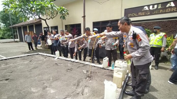 JEMBRANA, MediaBaliNews – Menjelang tutup tahun 2022, Polres Jembrana memusnahkan ratusan liter minuman keras (miras). Miras tersebut kemudian dituangkan diatas tumpukan pasir hingga bercampur pasir di halaman Mako Polres Jembrana, Kamis (29/12/2022).