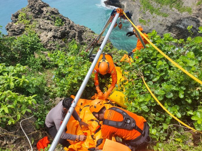 Tim SAR harus segera mencapai korban karena air laut mulai pasang, yang dikhawatirkan akan membawa tubuh korban terseret ombak dan mempersulit evakuasi. Setelah sekitar satu setengah jam menuruni tebing menggunakan tali, jenazah berhasil diangkat ke atas pada pukul 13.25 Wita. Korban diketahui berjenis kelamin perempuan dengan identitas yang belum diketahui, namun diperkirakan merupakan WNA.