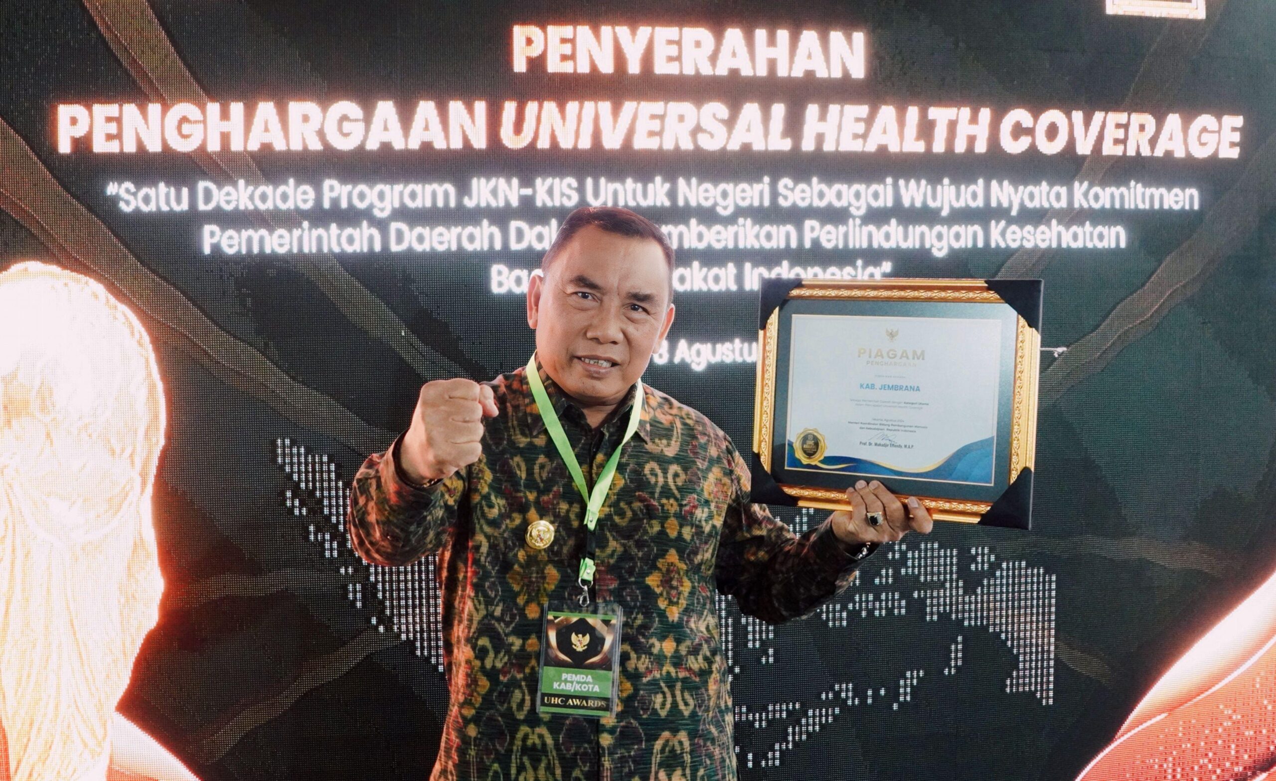 JEMBRANA, MediaBaliNews – Dua tahun berturut-turut , Pemerintah Kabupaten Jembrana kembali menerima penghargaan kategori utama dalam pencapaian Universal Health Coverage (UHC). Pencapaian Jembrana tergolong sempurna , artinya 100 persen penduduk tercover dalam penyelenggaraan Jaminan Kesehatan Nasional (JKN) Badan Penyelenggara Jaminan Sosial (BPJS) Kesehatan.