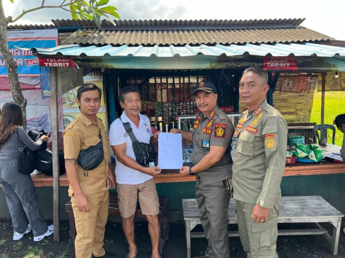 JEMBRANA, MediaBaliNews – Berpotensi menjadi mengganggu ketertiban dan kebersihan sekitar, petugas Satuan Polisi Pamong Praja (Satpol PP) Jembrana tertibkan sebuah warung di Desa Kaliakah, Kecamatan Negara, Kabupaten Jembrana, Senin (17/3).