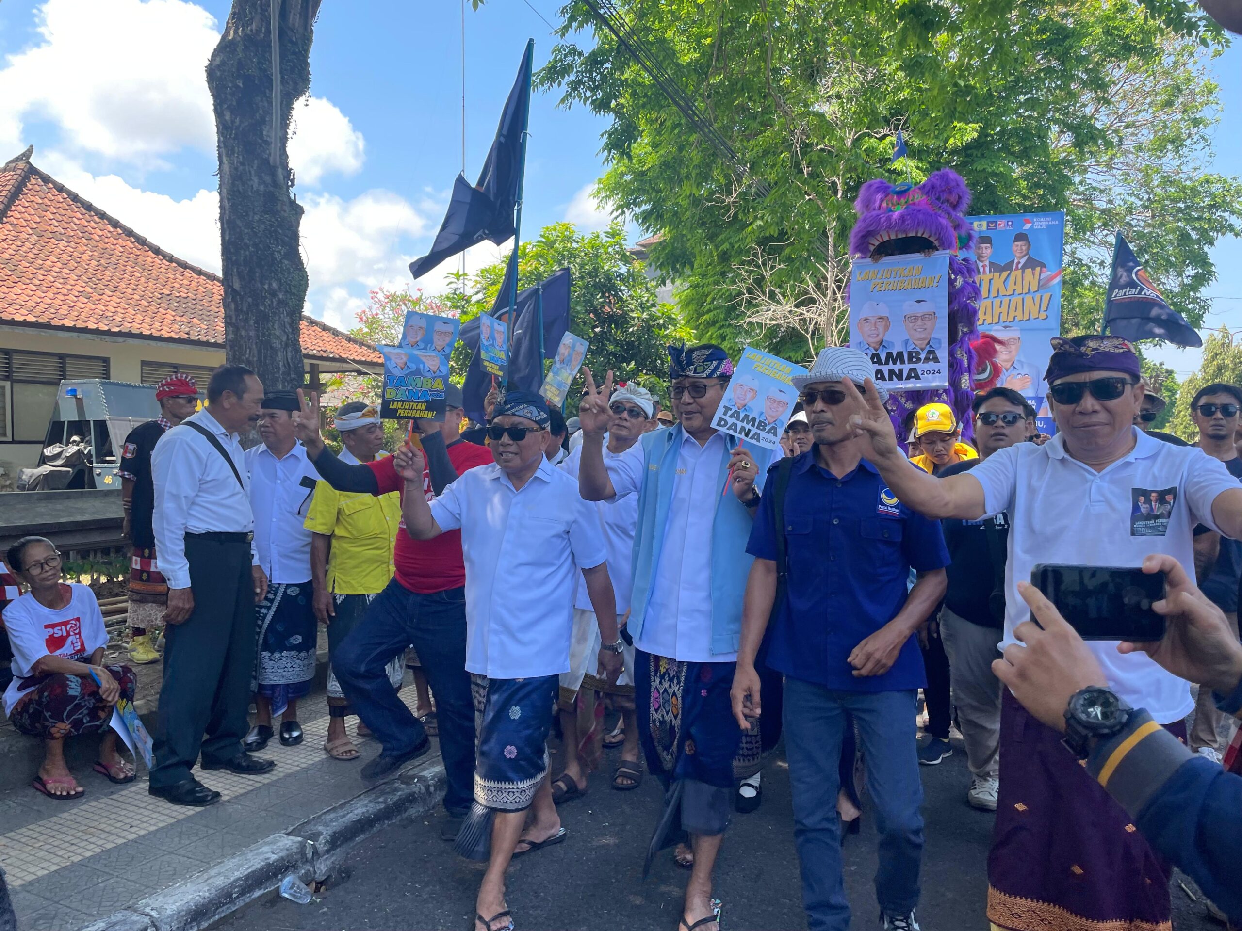 Dalam perjalanan menuju kantor KPU Jembrana, pasangan bakal calon Tamba-Dana yang diusung oleh 6 partai, 3 partai parlemen diantaranya Partai Demokrat, Partai Golkar dan Partai Gerindra sedangkan 3 partai non parlemen diantaranya Partai Nasdem, PSI dan PAN ini diiringi oleh musik tradisional, barong sai, dokar dan 2 pasang kerbau serta ribuan masa.