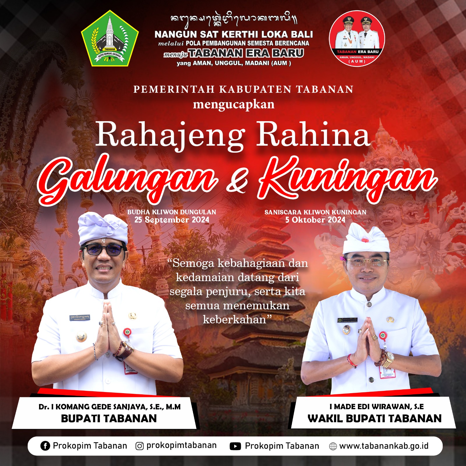 “Saya, I Komang Gede Sanjaya, Bupati Tabanan atas nama Pemerintah Kabupaten Tabanan, mengucapkan selamat Hari Raya Galungan dan Kuningan kepada seluruh umat swdharma dimanapun berada. Semoga Kebahagiaan dan Kedamaian datang dari segala penjuru, serta kita semua menemukan keberkahan,” ujar Sanjaya.