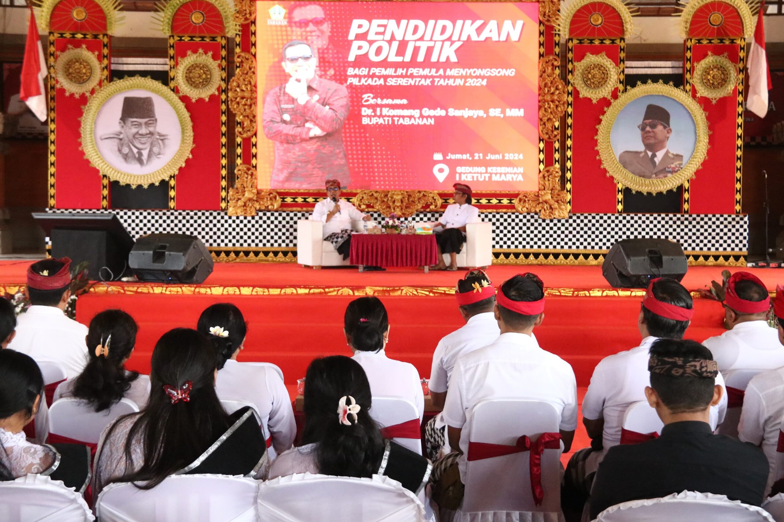 TABANAN, MediaBaliNews – Sebagai upaya untuk meningkatkan partisipasi pemilih pemula dalam menggunakan hak pilih dalam pilkada serentak, serta meningkatkan wawasan kebangsaan dan memberikan pemahaman akan bahaya penggunaan narkotika, Pemerintah Kabupaten Tabanan atas inisiasi Bupati Tabanan, Dr. I Komang Gede Sanjaya, S.E.,M.M, berikan pendidikan politik untuk generasi muda yang dirangkaikan dengan lomba Stand Up Comedy Tabanan. Kegiatan ini merupakan bagian dari peringatan bulan Bung Karno VI Tahun 2024.
