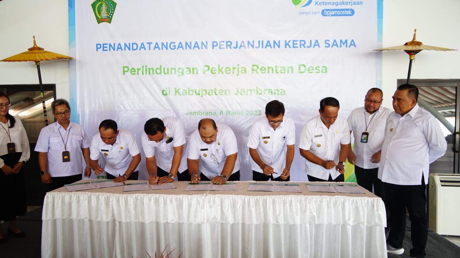 JEMBRANA, MediaBaliNews – Perhatian akan perlindungan masyarakat khususnya bagi para pekerja di Jembrana terus ditingkatkan. Teranyar, Jembrana menjadi kabupaten pertama di Bali yang memberikan jaminan sosial bagi pekerja rentan. Komitmen itu diwujudkan melalui  penandatanganan perjanjian kerjasama antara BPJS Ketenagakerjaan dengan Pemerintah Desa, Rabu (8/3) di Ruang Rapat, Gedung Sentra Tenun Jembrana.