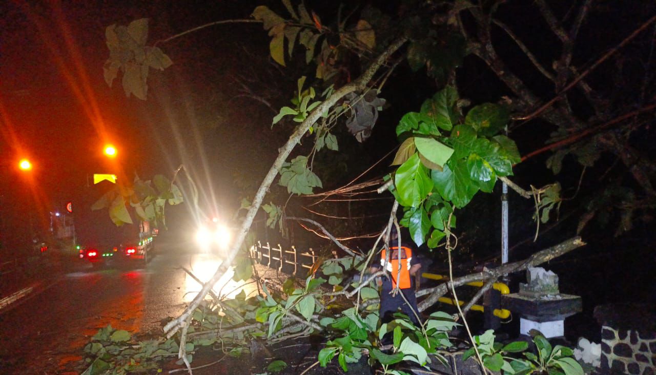 Peristiwa pertama terjadi pada Senin (1/12) sekitar pukul 23.40 Wita di KM 58–59 Jalan Raya Denpasar–Gilimanuk, tepatnya di sebelah barat Rumah Makan Legenda Kampung. Sebuah pohon sonokeling roboh dan menutup badan jalan setelah hujan deras serta angin kencang melanda wilayah Jembrana.