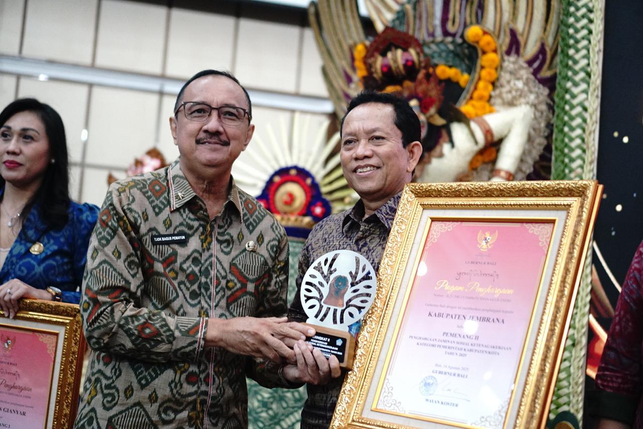 JEMBRANA, MediaBaliNews – Pemerintah Kabupaten Jembrana menorehkan prestasi gemilang dengan menyabet Penghargaan Jaminan Sosial Ketenagakerjaan (Paritrana Award) peringkat Kedua kategori Pemerintah Kabupaten/Kota se-Bali dan Desa Berangbang berhasil meraih peringkat pertama Paritrana Award Tahun 2025 untuk kategori Pemerintah Desa.