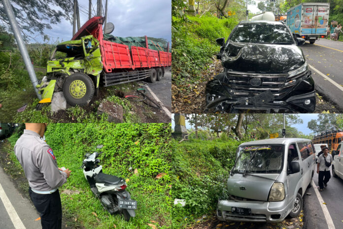 TABANAN, MediaBaliNews – Kecelakaan lalu lintas yang melibatkan truk tronton bermuatan sepeda motor terjadi di wilayah Kecamatan Selemadeg, Kabupaten Tabanan, pada Sabtu pagi. Dua orang mengalami luka-luka dan kini tengah menjalani perawatan medis. Peristiwa ini melibatkan enam kendaraan, termasuk satu unit sepeda motor yang dikendarai warga setempat.